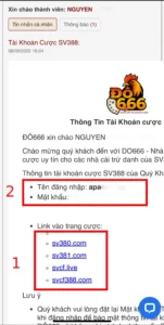 Trong phần thông báo, bạn sẽ thấy thông tin tài khoản cược SV388 đã được tích hợp sẵn khi bạn gia nhập do666. Hãy lưu lại tên đăng nhập, mật khẩu tạm thời và đường link truy cập trang cược được đính kèm.